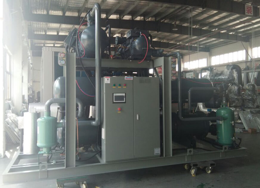 2.三元復(fù)疊酒精冷水機(jī)超低控溫制冷機(jī)組:其由高溫級(jí)(R404A/R22)、低溫級(jí)R23、超低溫級(jí)(R14)組合而成,低溫可提供-120℃超低溫工藝?yán)湓础C(jī)組制冷量范圍為3kw~300kw;